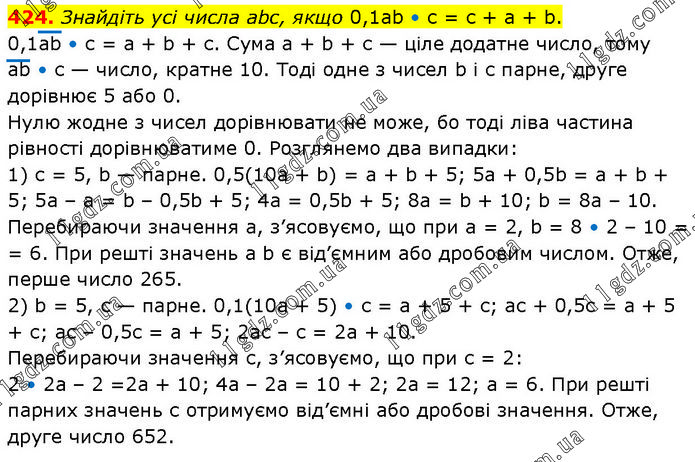 Знайдіть усі числа abc, якщо 0,1ab • с = с + а + b. 0,1аb • с = а + b + с. Сума а + b + с — ціле додатне число, тому ab • с — число, кратне 10. Тоді одне з чисел b і с парне, друге дорівнює 5 або 0. Нулю жодне з чисел дорівнювати не може, бо тоді ліва частина рівності дорівнюватиме 0. Розглянемо два випадки: 1) с = 5, b — парне. 0,5(10а + b) = а + b + 5; 5а + 0,5b = а + b + 5; 5а – а = b – 0,5b + 5; 4а = 0,5b + 5; 8а = b + 10; b = 8а – 10. Перебираючи значення а, з’ясовуємо, що при a = 2, b = 8 • 2 – 10 = = 6. При решті значень a b є від’ємним або дробовим числом. Отже, перше число 265. 2) b = 5, с — парне. 0,1(10а + 5) • с = а + 5 + с; ас + 0,5с = а + 5 + с; ас – 0,5с = а + 5; 2ас – с = 2а + 10. Перебираючи значення с, з’ясовуємо, що при с = 2: 2 • 2а – 2 =2а + 10; 4а – 2а = 10 + 2; 2а = 12; а = 6. При решті парних значень с отримуємо від’ємні або дробові значення. Отже, друге число 652.