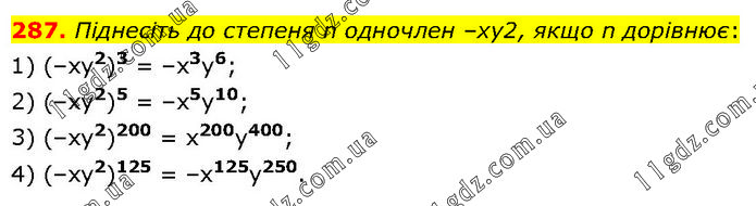 Піднесіть до степеня n одночлен –ху2, якщо n дорівнює: 1) (–xy2)3 = –x3y6; 2) (–xy2)5 = –x5y10; 3) (–xy2)200 = x200y400; 4) (–xy2)125 = –x125y250.