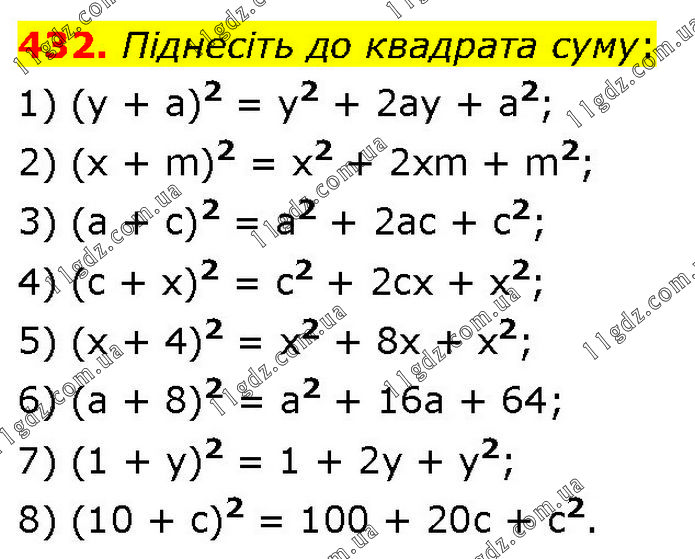 Піднесіть до квадрата суму: 1) (у + а)2 = у2 + 2ау + а2; 2) (x + m)2 = x2 + 2xm + m2; 3) (а + c)2 = a2 + 2ac + c2; 4) (c + x)2 = c2 + 2cx + x2; 5) (х + 4)2 = x2 + 8x + x2; 6) (а + 8)2 = a2 + 16a + 64; 7) (1 + у)2 = 1 + 2y + y2; 8) (10 + c)2 = 100 + 20c + c2.