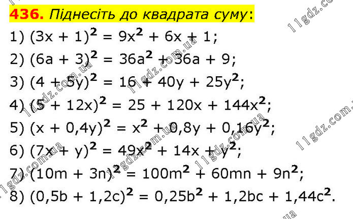 Піднесіть до квадрата суму: 1) (Зх + 1)2 = 9х2 + 6х + 1; 2) (6а + 3)2 = 36а2 + 36а + 9; 3) (4 + 5у)2 = 16 + 40у + 25у2; 4) (5 + 12х)2 = 25 + 120х + 144х2; 5) (х + 0,4у)2 = х2 + 0,8у + 0,16у2; 6) (7х + у)2 = 49х2 + 14х + у2; 7) (10m + 3n)2 = 100m2 + 60mn + 9n2; 8) (0,5b + 1,2с)2 = 0,25b2 + 1,2bc + 1,44c2.
