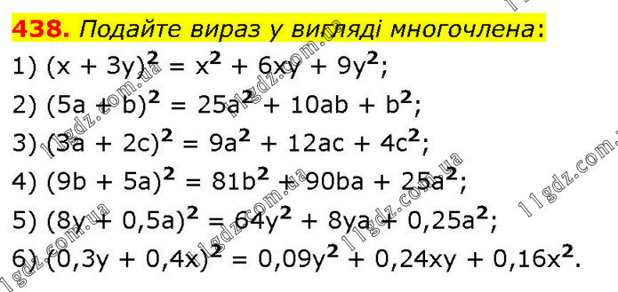 Подайте вираз у вигляді многочлена: 1) (х + Зу)2 = x2 + 6xy + 9y2; 2) (5а + b)2 = 25a2 + 10ab + b2; 3) (За + 2с)2 = 9a2 + 12ac + 4c2; 4) (9b + 5а)2 = 81b2 + 90ba + 25a2; 5) (8у + 0,5а)2 = 64y2 + 8ya + 0,25a2; 6) (0,3y + 0,4x)2 = 0,09y2 + 0,24xy + 0,16x2.