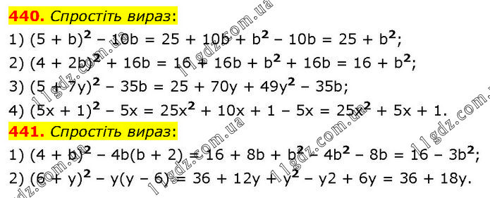 440. Спростіть вираз: 1) (5 + b)2 – 10b = 25 + 10b + b2 – 10b = 25 + b2; 2) (4 + 2b)2 + 16b = 16 + 16b + b2 + 16b = 16 + b2; 3) (5 + 7у)2 – 35b = 25 + 70y + 49y2 – 35b; 4) (5x + 1)2 – 5x = 25x2 + 10x + 1 – 5x = 25x2 + 5x + 1. 441. Спростіть вираз: 1) (4 + b)2 – 4b(b + 2) = 16 + 8b + b2 – 4b2 – 8b = 16 – 3b2; 2) (6 + у)2 – у(у – 6) = 36 + 12y + y2 – y2 + 6y = 36 + 18y.