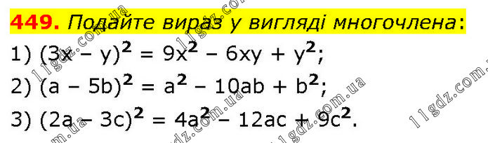 Подайте вираз у вигляді многочлена: 1) (Зx – у)2 = 9x2 – 6xy + y2; 2) (а – 5b)2 = a2 – 10ab + b2; 3) (2а – Зс)2 = 4a2 – 12ac + 9c2.