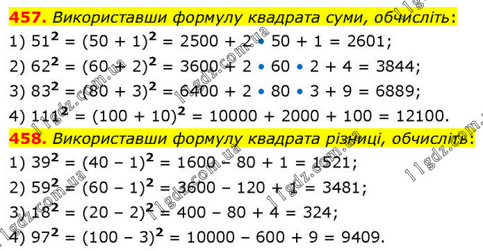 457. Використавши формулу квадрата суми, обчисліть: 1) 512 = (50 + 1)2 = 2500 + 2 • 50 + 1 = 2601; 2) 622 = (60 + 2)2 = 3600 + 2 • 60 • 2 + 4 = 3844; 3) 832 = (80 + 3)2 = 6400 + 2 • 80 • 3 + 9 = 6889; 4) 1112 = (100 + 10)2 = 10000 + 2000 + 100 = 12100. 458. Використавши формулу квадрата різниці, обчисліть: 1) 392 = (40 – 1)2 = 1600 – 80 + 1 = 1521; 2) 592 = (60 – 1)2 = 3600 – 120 + 1 = 3481; 3) 182 = (20 – 2)2 = 400 – 80 + 4 = 324; 4) 972 = (100 – 3)2 = 10000 – 600 + 9 = 9409.