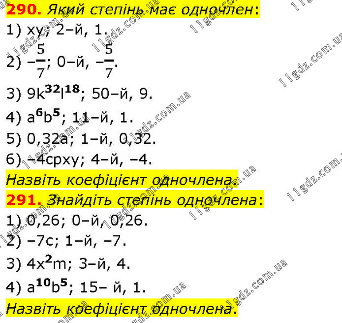 290. Який степінь має одночлен: 1) ху; 2–й, 1. 2) –5/7; 0–й, –5/7. 3) 9k32l18; 50–й, 9. 4) а6b5; 11–й, 1. 5) 0,32а; 1–й, 0,32. 6) –4cpxy; 4–й, –4. Назвіть коефіцієнт одночлена. 291. Знайдіть степінь одночлена: 1) 0,26; 0–й, 0,26. 2) –7с; 1–й, –7. 3) 4х2m; 3–й, 4. 4) а10b5; 15– й, 1. Назвіть коефіцієнт одночлена.