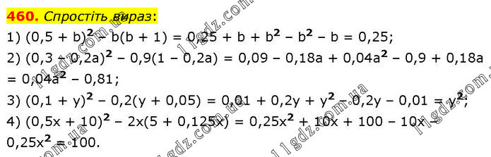 Спростіть вираз: 1) (0,5 + b)2 – b(b + 1) = 0,25 + b + b2 – b2 – b = 0,25; 2) (0,3 – 0,2а)2 – 0,9(1 – 0,2а) = 0,09 – 0,18a + 0,04a2 – 0,9 + 0,18a = 0,04a2 – 0,81; 3) (0,1 + у)2 – 0,2(у + 0,05) = 0,01 + 0,2y + y2 – 0,2y – 0,01 = y2; 4) (0,5x + 10)2 – 2x(5 + 0,125x) = 0,25x2 + 10x + 100 – 10x – 0,25x2 = 100.