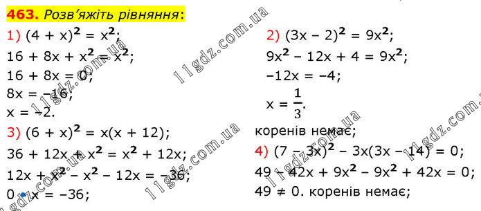 Розв’яжіть рівняння: 1) (4 + x)2 = x2; 16 + 8x + x2 = x2; 16 + 8x = 0; 8x = –16; х = –2. 2) (Зx – 2)2 = 9х2; 9x2 – 12х + 4 = 9x2; –12х = –4; х = 1/3. 3) (6 + x)2 = x(x + 12); 36 + 12x + x2 = x2 + 12x; 12x + x2 – x2 – 12x = –36; 0 • x = –36; коренів немає; 4) (7 – 3x)2 – 3x(3x – 14) = 0; 49 – 42x + 9x2 – 9x2 + 42x = 0; 49 ≠ 0. коренів немає;