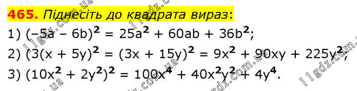 Піднесіть до квадрата вираз: 1) (–5а – 6b)2 = 25a2 + 60ab + 36b2; 2) (3(x + 5у)2 = (3x + 15y)2 = 9x2 + 90xy + 225y2; 3) (10x2 + 2у2)2 = 100x4 + 40x2y2 + 4y4.