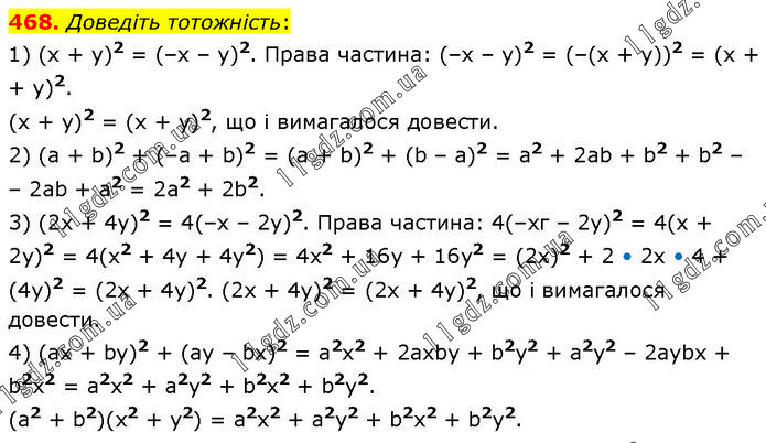 Доведіть тотожність: 1) (x + у)2 = (–x – у)2. Права частина: (–x – у)2 = (–(x + у))2 = (x + у)2. (x + у)2 = (x + у)2, що і вимагалося довести. 2) (a + b)2 + (–a + b)2 = (a + b)2 + (b – a)2 = a2 + 2ab + b2 + b2 – 2ab + a2 = 2a2 + 2b2. 3) (2х + 4y)2 = 4(–х – 2y)2. Права частина: 4(–хг – 2у)2 = 4(х + 2у)2 = 4(х2 + 4у + 4у2) = 4x2 + 16у + 16y2 = (2х)2 + 2 • 2х • 4 + (4y)2 = (2x + 4y)2. (2x + 4у)2 = (2х + 4у)2, що і вимагалося довести. 4) (ах + by)2 + (ay – bx)2 = a2x2 + 2axby + b2y2 + a2y2 – 2aybx + b2x2 = a2x2 + a2y2 + b2x2 + b2y2. (а2 + b2)(x2 + у2) = a2x2 + a2y2 + b2x2 + b2y2.