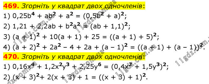 469. Згорніть у квадрат двох одночленів: 1) 0,25b4 + аb2 + а2 = (0,5b2 + a)2; 2) 1,21 + 2,2аb + b2а2 = (ab + 1,1)2; 3) (а + 1)2 + 10(а + 1) + 25 = ((a + 1) + 5)2; 4) (а + 2)2 + 2а2 – 4 + 2а + (а – 1)2 = ((a + 1) + (a – 1))2. 470. Згорніть у квадрат двох одночленів: 1) 0,16x4 + 1,2х2у3 + 2,25y6 = (0,4x2 + 1,5y3)2; 2) (x + З)2+ 2(x + 3) + 1 = ((x + 3) + 1)2.