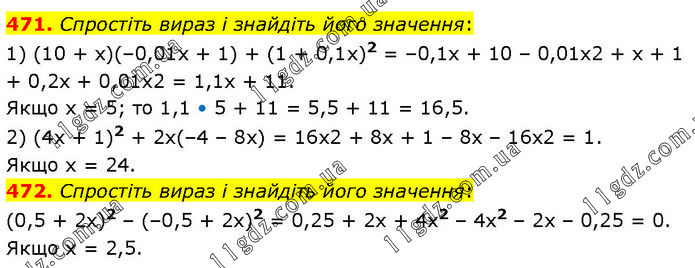 471. Спростіть вираз і знайдіть його значення: 1) (10 + x)(–0,01x + 1) + (1 + 0,1x)2 = –0,1х + 10 – 0,01х2 + х + 1 + 0,2х + 0,01х2 = 1,1х + 11. Якщо х = 5; то 1,1 • 5 + 11 = 5,5 + 11 = 16,5. 2) (4х + 1)2 + 2x(–4 – 8x) = 16х2 + 8х + 1 – 8х – 16х2 = 1. Якщо x = 24. 472. Спростіть вираз і знайдіть його значення: (0,5 + 2х)2 – (–0,5 + 2х)2 = 0,25 + 2х + 4х2 – 4х2 – 2х – 0,25 = 0. Якщо х = 2,5.