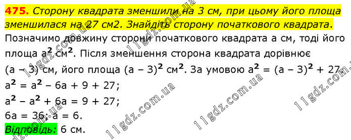 Сторону квадрата зменшили на 3 см, при цьому його площа зменшилася на 27 см2. Знайдіть сторону початкового квадрата. Позначимо довжину сторони початкового квадрата а см, тоді його площа а2 см2. Після зменшення сторона квадрата дорівнює (а – 3) см, його площа (а – З)2 см2. За умовою а2 = (а – З)2 + 27. а2 = а2 – 6а + 9 + 27; а2 – а2 + 6а = 9 + 27; 6а = 36; а = 6. Відповідь: 6 см.
