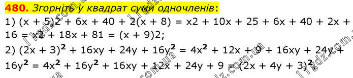 Згорніть у квадрат суми одночленів: 1) (х + 5)2 + 6х + 40 + 2(х + 8) = х2 + 10х + 25 + 6х + 40 + 2х + 16 = х2 + 18х + 81 = (х + 9)2; 2) (2х + З)2 + 16ху + 24у + 16у2 = 4х2 + 12х + 9 + 16ху + 24у + 16у2 = 4х2 + 16у2 + 16ху + 12х + 24у + 9 = (2х + 4у + 3)2.