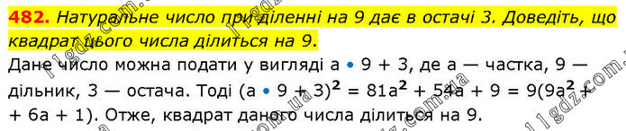 Натуральне число при діленні на 9 дає в остачі 3. Доведіть, що квадрат цього числа ділиться на 9. Дане число можна подати у вигляді а • 9 + 3, де а — частка, 9 — дільник, 3 — остача. Тоді (а • 9 + З)2 = 81а2 + 54а + 9 = 9(9а2 + + 6а + 1). Отже, квадрат даного числа ділиться на 9.