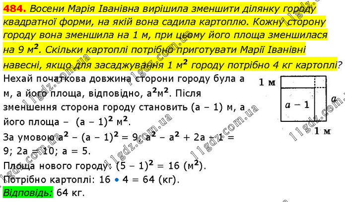 Восени Марія Іванівна вирішила зменшити ділянку городу квадратної форми, на якій вона садила картоплю. Кожну сторону городу вона зменшила на 1 м, при цьому його площа зменшилася на 9 м2. Скільки картоплі потрібно приготувати Марії Іванівні навесні, якщо для засаджування 1 м2 городу потрібно 4 кг картоплі? Нехай початкова довжина сторони городу була а м, а його площа, відповідно, а2м2. Після зменшення сторона городу становить (а – 1) м, а його площа – (а – 1)2 м2. За умовою а2 – (а – 1)2 = 9; a2 – a2 + 2a – 1 = 9; 2a = 10; а = 5. Площа нового городу: (5 – 1)2 = 16 (м2). Потрібно картоплі: 16 • 4 = 64 (кг). Відповідь: 64 кг.