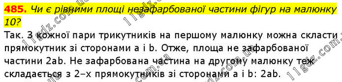 Чи є рівними площі незафарбованої частини фігур на малюнку 10? Так. З кожної пари трикутників на першому малюнку можна скласти прямокутник зі сторонами а і b. Отже, площа не зафарбованої частини 2ab. He зафарбована частина на другому малюнку теж складається з 2–х прямокутників зі сторонами а і b: 2ab.