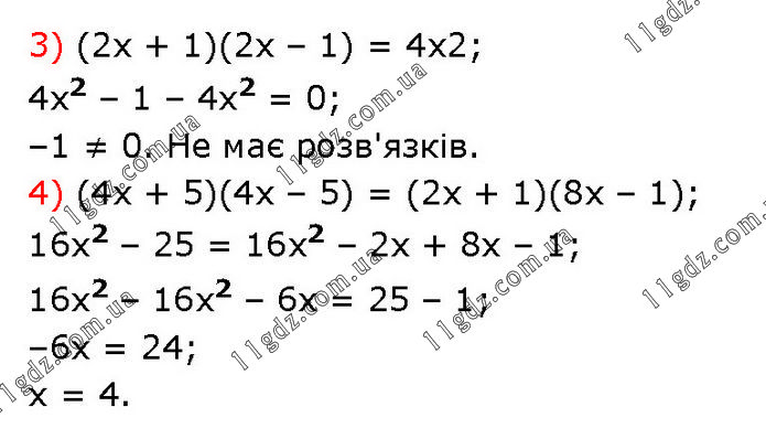 3) (2х + 1)(2х – 1) = 4х2; 4х2 – 1 – 4х2 = 0; –1 ≠ 0. Не має розв'язків. 4) (4х + 5)(4х – 5) = (2х + 1)(8х – 1); 16х2 – 25 = 16х2 – 2х + 8х – 1; 16х2 – 16х2 – 6х = 25 – 1; –6х = 24; х = 4.