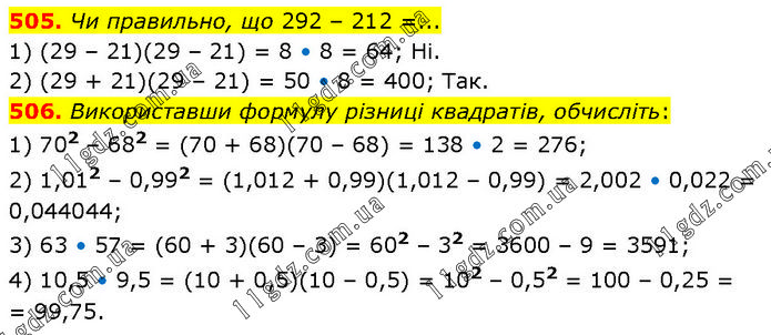505. Чи правильно, що 292 – 212 =... 1) (29 – 21)(29 – 21) = 8 • 8 = 64; Ні. 2) (29 + 21)(29 – 21) = 50 • 8 = 400; Так. 506. Використавши формулу різниці квадратів, обчисліть: 1) 702 – 682 = (70 + 68)(70 – 68) = 138 • 2 = 276; 2) 1,012 – 0,992 = (1,012 + 0,99)(1,012 – 0,99) = 2,002 • 0,022 = 0,044044; 3) 63 • 57 = (60 + 3)(60 – 3) = 602 – 32 = 3600 – 9 = 3591; 4) 10,5 • 9,5 = (10 + 0,5)(10 – 0,5) = 102 – 0,52 = 100 – 0,25 = = 99,75.