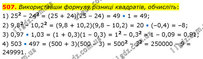 Використавши формулу різниці квадратів, обчисліть: 1) 252 – 242 = (25 + 24)(25 – 24) = 49 • 1 = 49; 2) 9,82 – 10,22 = (9,8 + 10,2)(9,8 – 10,2) = 20 • (–0,4) = –8; 3) 0,97 • 1,03 = (1 + 0,3)(1 – 0,3) = 12 – 0,32 = 1 – 0,09 = 0,91; 4) 503 • 497 = (500 + 3)(500 – 3) = 5002 – 32 = 250000 – 9 = 249991.