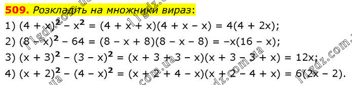 Розкладіть на множники вираз: 1) (4 + х)2 – х2 = (4 + х + х)(4 + х – х) = 4(4 + 2х); 2) (8 – х)2 – 64 = (8 – х + 8)(8 – х – 8) = –х(16 – х); 3) (х + З)2 – (3 – х)2 = (х + 3 + 3 – х)(х + 3 – 3 + х) = 12х; 4) (х + 2)2 – (4 – х)2 = (х + 2 + 4 – х)(х + 2 – 4 + х) = 6(2х – 2).
