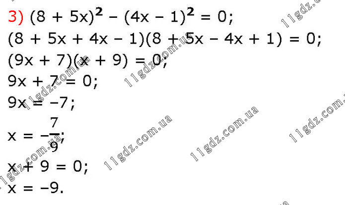 3) (8 + 5х)2 – (4х – 1)2 = 0; (8 + 5х + 4х – 1)(8 + 5х – 4х + 1) = 0; (9х + 7)(х + 9) = 0; 9х + 7 = 0; 9х = –7; х = –7/9; х + 9 = 0; х = –9.