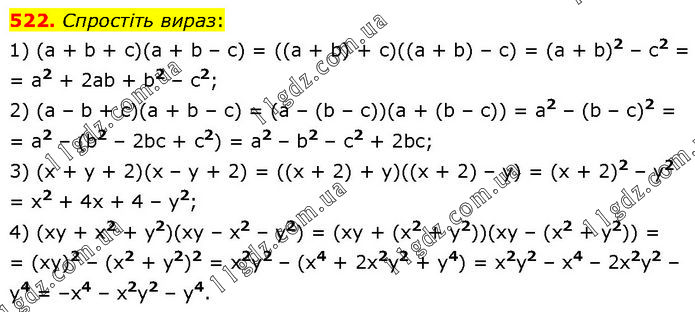 Спростіть вираз: 1) (a + b + с)(а + b – с) = ((а + b) + с)((а + b) – с) = (а + b)2 – с2 = = а2 + 2аb + b2 – с2; 2) (а – b + с)(а + b – с) = (а – (b – с))(а + (b – с)) = a2 – (b – с)2 = = а2 – (b2 – 2bс + с2) = а2 – b2 – с2 + 2bс; 3) (х + у + 2)(х – у + 2) = ((х + 2) + у)((х + 2) – у) = (х + 2)2 – у2 = x2 + 4х + 4 – у2; 4) (ху + x2 + у2)(ху – х2 – у2) = (ху + (х2 + у2))(ху – (х2 + у2)) = = (ху)2 – (х2 + у2)2 = х2у2 – (х4 + 2х2у2 + у4) = х2у2 – x4 – 2х2у2 – у4 = –x4 – х2у2 – у4.