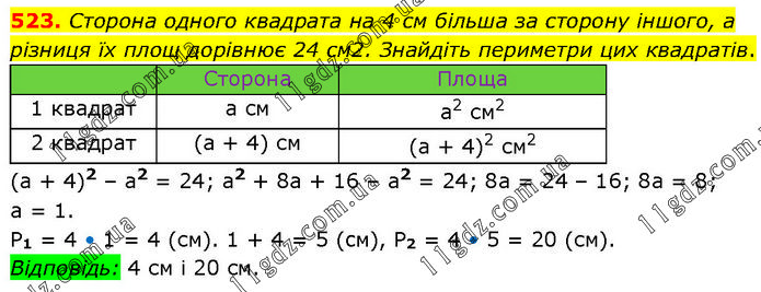 Сторона одного квадрата на 4 см більша за сторону іншого, а різниця їх площ дорівнює 24 см2. Знайдіть периметри цих квадратів. Сторона Площа 1 квадрат а см а2 см2 2 квадрат (а + 4) см (а + 4)2 см2 (a + 4)2 – а2 = 24; а2 + 8а + 16 – а2 = 24; 8а = 24 – 16; 8а = 8; а = 1. P1 = 4 • 1 = 4 (см). 1 + 4 = 5 (cм), P2 = 4 • 5 = 20 (см). Відповідь: 4 см і 20 см.