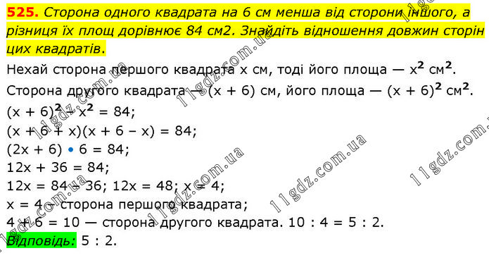 Сторона одного квадрата на 6 см менша від сторони іншого, а різниця їх площ дорівнює 84 см2. Знайдіть відношення довжин сторін цих квадратів. Нехай сторона першого квадрата х см, тоді його площа — х2 см2. Сторона другого квадрата — (х + 6) см, його площа — (х + 6)2 см2. (х + 6)2 – x2 = 84; (х + 6 + х)(х + 6 – х) = 84; (2х + 6) • 6 = 84; 12х + 36 = 84; 12х = 84 – 36; 12х = 48; х = 4; х = 4 – cторона першого квадрата; 4 + 6 = 10 — сторона другого квадрата. 10 : 4 = 5 : 2. Відповідь: 5 : 2.