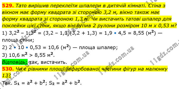 529. Тато вирішив переклеїти шпалери в дитячій кімнаті. Стіна з вікном має форму квадрата зі стороною 3,2 м, вікно також має форму квадрата зі стороною 1,3 м. Чи вистачить татові шпалер для поклейки цієї стіни, якщо він купив 2 рулони розміром 10 м х 0,53 м? 1) 3,22 – 1,32 = (3,2 – 1,3)(3,2 + 1,3) = 1,9 • 4,5 = 8,55 (м2) — площа стіни; 2) 2 • 10 • 0,53 = 10,6 (м2) — площа шпалер; 3) 10,6 м2 > 8,55 м2. Відповідь: так, вистачить. 530. Чи є рівними площі зафарбованої частини фігур на малюнку 13? Так. S1 = а2 + b2; S2 = а2 + b2.