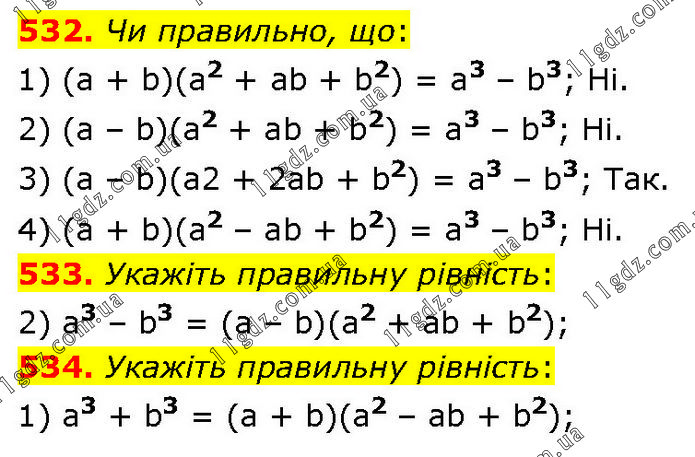 532. Чи правильно, що: 1) (а + b)(a2 + ab + b2) = а3 – b3; Ні. 2) (а – b)(а2 + ab + b2) = а3 – b3; Ні. 3) (а – b)(а2 + 2аb + b2) = а3 – b3; Так. 4) (а + b)(а2 – ab + b2) = а3 – b3; Ні. 533. Укажіть правильну рівність: 2) a3 – b3 = (a – b)(a2 + ab + b2); 534. Укажіть правильну рівність: 1) а3 + b3 = (а + b)(а2 – ab + b2);