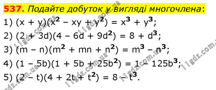 Подайте добуток у вигляді многочлена: 1) (х + у)(х2 – ху + у2) = x3 + y3; 2) (2 + 3d)(4 – 6d + 9d2) = 8 + d3; 3) (m – n)(m2 + mn + n2) = m3 – n3; 4) (1 – 5b)(1 + 5b + 25b2) = 1 – 125b3; 5) (2 – t)(4 + 2t + t2) = 8 – t3.