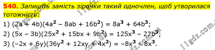 Запишіть замість зірочки такий одночлен, щоб утворилася тотожність: 1) (2а + 4b)(4а2 – 8аb + 16b2) = 8a3 + 64b3; 2) (5x – Зb)(25x2 + 15bx + 9b2) = 125x3 – 27b3; 3) (–2х + 6у)(36у2 + 12ху + 4x2) = –8x3 – 8x3.