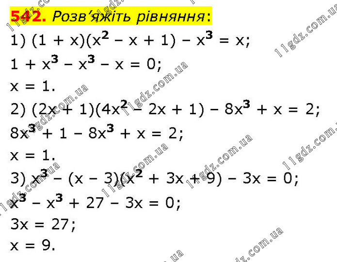 + х)(х2 – х + 1) – х3 = х; 1 + х3 – х3 – х = 0; х = 1. 2) (2х + 1)(4х2 – 2х + 1) – 8х3 + х = 2; 8х3 + 1 – 8х3 + х = 2; х = 1. 3) х3 – (х – 3)(х2 + 3х + 9) – 3х = 0; х3 – х3 + 27 – 3х = 0; 3х = 27; х = 9.