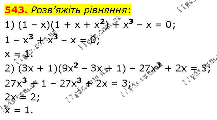Розв’яжіть рівняння: 1) (1 – х)(1 + х + х2) + х3 – х = 0; 1 – х3 + х3 – х = 0; х = 1. 2) (Зх + 1)(9х2 – Зх + 1) – 27х3 + 2х = 3; 27х3 + 1 – 27х3 + 2х = 3; 2х = 2; х = 1.