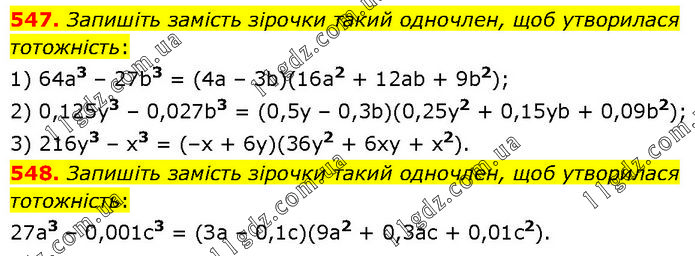 547. Запишіть замість зірочки такий одночлен, щоб утворилася тотожність: 1) 64a3 – 27b3 = (4а – 3b)(16а2 + 12аb + 9b2); 2) 0,125y3 – 0,027b3 = (0,5y – 0,3b)(0,25y2 + 0,15yb + 0,09b2); 3) 216y3 – x3 = (–x + 6у)(36у2 + 6xy + x2). 548. Запишіть замість зірочки такий одночлен, щоб утворилася тотожність: 27а3 – 0,001с3 = (За – 0,1c)(9а2 + 0,3ас + 0,01с2).