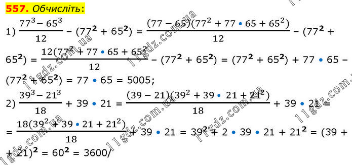 Обчисліть: 1) (77^3- 65^3)/12 – (772 + 652) = ((77 - 65)(77^2 + 77 • 65 + 65^2))/12 – (772 + 652) = (12(77^2 + 77 • 65 + 65^2)/12 – (772 + 652) = (772 + 652) + 77 • 65 – (772 + 652) = 77 • 65 = 5005; 2) (39^3- 21^3)/18 + 39 • 21 = ((39 - 21)(39^2 + 39 • 21 + 21^2))/18 + 39 • 21 = = (18(39^2 + 39 • 21 + 21^2))/18 + 39 • 21 = 392 + 2 • 39 • 21 + 212 = (39 + + 21)2 = 602 = 3600.