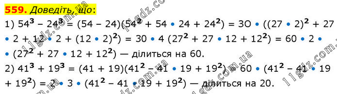 Доведіть, що: 1) 543 – 243 = (54 – 24)(542 + 54 • 24 + 242) = ЗО • ((27 • 2)2 + 27 • 2 + 12 • 2 + (12 • 2)2) = 30 • 4 (272 + 27 • 12 + 122) = 60 • 2 • (272 + 27 • 12 + 122) — ділиться на 60. 2) 413 + 193 = (41 + 19)(412 – 41 • 19 + 192) = 60 • (412 – 41 • 19 + 192) = 2 • 3 • (412 – 41 • 19 + 192) — ділиться на 20.