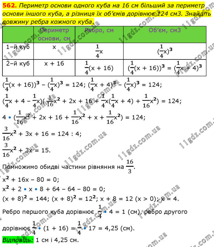 Периметр основи одного куба на 16 см більший за периметр основи іншого куба, а різниця їх об’ємів дорівнює 124 см3. Знайдіть довжину ребра кожного куба. (1/4(x + 16))3 – (1/4x)3 = 124; (1/4x + 4)3 – (1/4x)3 = 124; (1/4x + 4 – 1/4x)( 1/16x2 + 2x + 16 + 1/4x(1/4x + 4) + 1/16x2) = 124; 4 • (1/16x2 + 2x + 16 + 1/16x2 + x + 1/16x2) = 124; 3/16x2 + 3x + 16 = 124 : 4; 3/16x2 + 3x = 15. Помножимо обидві частини рівняння на 16/3. x2 + 16х – 80 = 0; x2 + 2 • х • 8 + 64 – 64 – 80 = 0; (х + 8)2 = 144; (х + 8)2 = 122; х + 8 = 12 (х > 0); х = 4. Ребро першого куба дорівнює 1/4 • 4 = 1 (см), ребро другого дорівнює 1/4 • (1 + 16) = 1/4 • 17 = 4,25 (см). Відповідь: 1 см і 4,25 см.