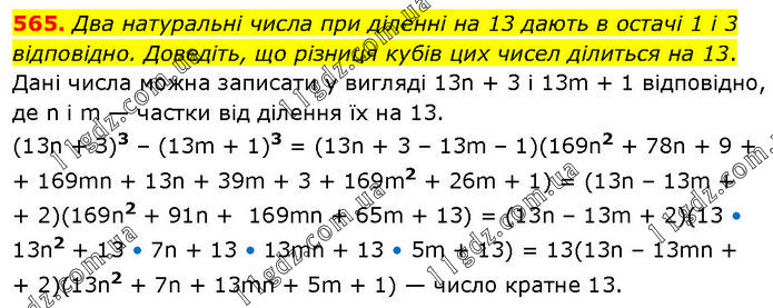 Два натуральні числа при діленні на 13 дають в остачі 1 і 3 відповідно. Доведіть, що різниця кубів цих чисел ділиться на 13. Дані числа можна записати у вигляді 13n + 3 і 13m + 1 відповідно, де n і m — частки від ділення їх на 13. (13n + З)3 – (13m + 1)3 = (13n + 3 – 13m – 1)(169n2 + 78n + 9 + 169mn + 13n + 39m + 3 + 169m2 + 26m + 1) = (13n – 13m + 2)(169n2 + 91n + 169mn + 65m + 13) = (13n – 13m + 2)(13 • 13n2 + 13 • 7n + 13 • 13mn + 13 • 5m + 13) = 13(13n – 13mn + 2)(13n2 + 7n + 13mn + 5m + 1) — число кратне 13.