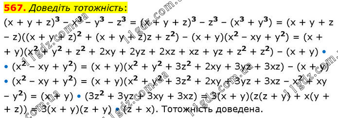 Доведіть тотожність: (x + у + z)3 – x3 – у3 – z3 = (х + у + z)3 – z3 – (x3 + у3) = (x + у + z – z)((x + у + z)2 + (x + у + z)z + z2) – (x + у)(х2 – ху + у2) = (х + у)(х2 + у2 + z2 + 2ху + 2yz + 2xz + xz + yz + z2 + z2) – (x + у) • (x2 – ху + у2) = (x + у)(х2 + у2 + Зz2 + 2ху + Зуz + Зхz) – (х + у) • (х2 – ху + у2) = (х + у)(х2 + у2 + Зz2 + 2ху + Зуz + Зхz – x2 + ху – у2) = (х + у) • (Зz2 + Зуz + Зху + Зxz) = 3(x + у)(z(z + у) + х(у + + z)) = 3(x + у)(z + у) • (z + x). Тотожність доведена.
