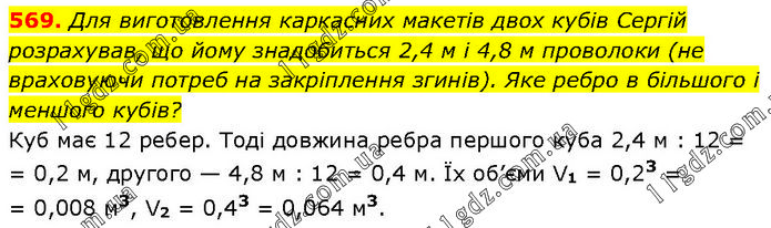 Для виготовлення каркасних макетів двох кубів Сергій розрахував, що йому знадобиться 2,4 м і 4,8 м проволоки (не враховуючи потреб на закріплення згинів). Яке ребро в більшого і меншого кубів? Куб має 12 ребер. Тоді довжина ребра першого куба 2,4 м : 12 = 0,2 м, другого — 4,8 м : 12 = 0,4 м. Їх об’єми V1 = 0,23 = 0,008 м3, V2 = 0,43 = 0,064 м3.