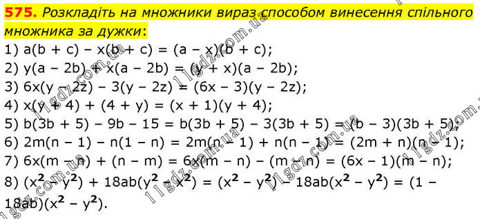 Розкладіть на множники вираз способом винесення спільного множника за дужки: 1) а(b + с) – х(b + с) = (a – x)(b + c); 2) у(а – 2b) + х(а – 2b) = (y + x)(a – 2b); 3) 6x(y – 2z) – 3(у – 2z) = (6x – 3)(y – 2z); 4) х(у + 4) + (4 + у) = (x + 1)(y + 4); 5) b(3b + 5) – 9b – 15 = b(3b + 5) – 3(3b + 5) = (b – 3)(3b + 5); 6) 2m(n – 1) – n(1 – n) = 2m(n – 1) + n(n – 1) = (2m + n)(n – 1); 7) 6х(m – n) + (n – m) = 6x(m – n) – (m – n) = (6x – 1)(m – n); 8) (х2 – у2) + 18аb(у2 – х2) = (x2 – y2) – 18ab(x2 – y2) = (1 – 18ab)(x2 – y2).
