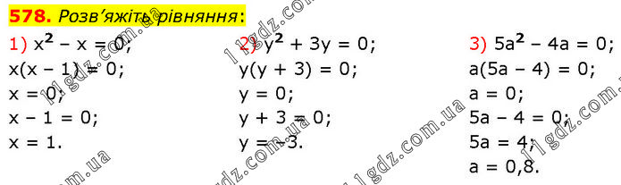 Розв’яжіть рівняння: 1) x2 – х = 0; x(x – 1) = 0; x = 0; x – 1 = 0; x = 1. 2) у2 + Зу = 0; y(y + 3) = 0; y = 0; y + 3 = 0; y = –3. 3) 5а2 – 4а = 0; a(5a – 4) = 0; a = 0; 5a – 4 = 0; 5a = 4; a = 0,8.