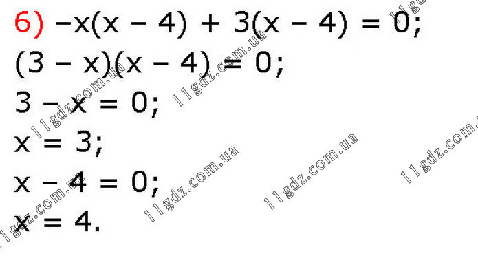 6) –х(х – 4) + 3(х – 4) = 0; (3 – x)(x – 4) = 0; 3 – x = 0; x = 3; x – 4 = 0; x = 4.
