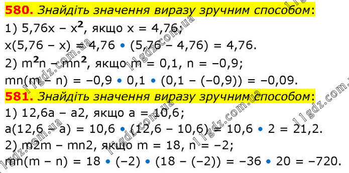 580. Знайдіть значення виразу зручним способом: 1) 5,76х – х2, якщо х = 4,76; x(5,76 – x) = 4,76 • (5,76 – 4,76) = 4,76. 2) m2n – mn2, якщо m = 0,1, n = –0,9; mn(m – n) = –0,9 • 0,1 • (0,1 – (–0,9)) = –0,09. 581. Знайдіть значення виразу зручним способом: 1) 12,6а – а2, якщо а = 10,6; a(12,6 – a) = 10,6 • (12,6 – 10,6) = 10,6 • 2 = 21,2. 2) m2m – mn2, якщо m = 18, n = –2; mn(m – n) = 18 • (–2) • (18 – (–2)) = –36 • 20 = –720.