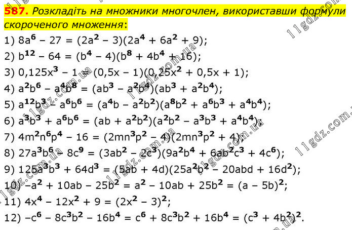 Розкладіть на множники многочлен, використавши формули скороченого множення: 1) 8а6 – 27 = (2a2 – 3)(2a4 + 6a2 + 9); 2) b12 – 64 = (b4 – 4)(b8 + 4b4 + 16); 3) 0,125x3 – 1 = (0,5x – 1)(0,25x2 + 0,5x + 1); 4) а2b6 – а4b8 = (ab3 – a2b4)(ab3 + a2b4); 5) а12b3 – а6b6 = (a4b – a2b2)(a8b2 + a6b3 + a4b4); 6) а3b3 + а6b6 = (ab + a2b2)(a2b2 – a3b3 + a4b4); 7) 4m2n6p4 – 16 = (2mn3p2 – 4)(2mn3p2 + 4); 8) 27а3b6 – 8с9 = (3ab2 – 2c3)(9a2b4 + 6ab2c3 + 4c6); 9) 125а3b3 + 64d3 = (5ab + 4d)(25a2b2 – 20abd + 16d2); 10) –а2 + 10аb – 25b2 = a2 – 10ab + 25b2 = (a – 5b)2; 11) 4x4 – 12x2 + 9 = (2x2 – 3)2; 12) –с6 – 8с3b2 – 16b4 = c6 + 8c3b2 + 16b4 = (c3 + 4b2)2.