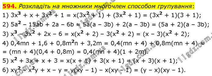 Розкладіть на множники многочлен способом групування: 1) 3x3 + х + Зх2 + 1 = x(3x2 + 1) + (Зx2 + 1) = (3x2 + 1)(3 + 1); 2) 5а2 – 15аb + 2а – 6b = 5а(а – 3b) + 2(а – 3b) = (5а + 2)(а – 3b); 3) x3 – Зx2 + 2х – 6 = x(x2 + 2) – 3(x2 + 2) = (x – 3)(x2 + 2); 4) 0,4mn + 1,6 + 0,8m2n + 3,2m = 0,4(mn + 4) + 0,8m(mn + 4) = (mn + 4)(0,4 + 0,8m) = 0,4(mn + 4)(1 + 2m). 5) x2 + Зx + х + 3 = x(x + 1) + 3(x + 1) = (x + 3)(x + 1); 6) ху2 – х2у + х – у = y(xy – 1) – x(xy – 1) = (y – x)(xy – 1).