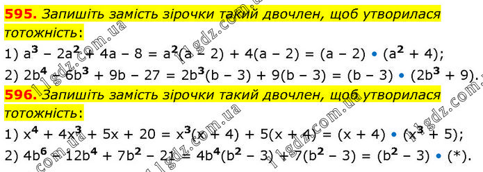 595. Запишіть замість зірочки такий двочлен, щоб утворилася тотожність: 1) а3 – 2а2 + 4а – 8 = a2(a – 2) + 4(a – 2) = (а – 2) • (a2 + 4); 2) 2b4 – 6b3 + 9b – 27 = 2b3(b – 3) + 9(b – 3) = (b – 3) • (2b3 + 9). 596. Запишіть замість зірочки такий двочлен, щоб утворилася тотожність: 1) x4 + 4x3 + 5х + 20 = x3(x + 4) + 5(x + 4) = (x + 4) • (x3 + 5); 2) 4b6 – 12b4 + 7b2 – 21 = 4b4(b2 – 3) + 7(b2 – 3) = (b2 – 3) • (*).