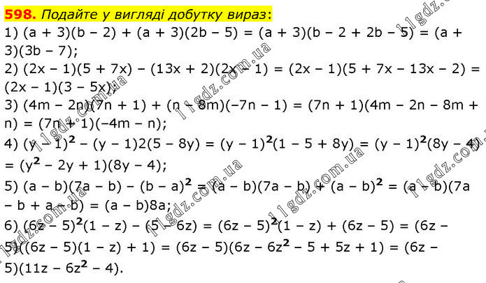 Подайте у вигляді добутку вираз: 1) (а + 3)(b – 2) + (а + 3)(2b – 5) = (a + 3)(b – 2 + 2b – 5) = (a + 3)(3b – 7); 2) (2х – 1)(5 + 7x) – (13x + 2)(2x – 1) = (2x – 1)(5 + 7x – 13x – 2) = (2x – 1)(3 – 5x); 3) (4m – 2n)(7n + 1) + (n – 8m)(–7n – 1) = (7n + 1)(4m – 2n – 8m + n) = (7n + 1)(–4m – n); 4) (у – 1)2 – (у – 1)2(5 – 8y) = (y – 1)2(1 – 5 + 8y) = (y – 1)2(8y – 4) = (y2 – 2y + 1)(8y – 4); 5) (а – b)(7а – b) – (b – а)2 = (a – b)(7a – b) + (a – b)2 = (a – b)(7a – b + a – b) = (a – b)8a; 6) (6z – 5)2(1 – z) – (5 – 6z) = (6z – 5)2(1 – z) + (6z – 5) = (6z – 5)((6z – 5)(1 – z) + 1) = (6z – 5)(6z – 6z2 – 5 + 5z + 1) = (6z – 5)(11z – 6z2 – 4).