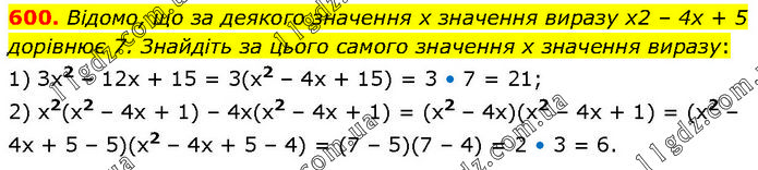 Відомо, що за деякого значення х значення виразу x2 – 4x + 5 дорівнює 7. Знайдіть за цього самого значення x значення виразу: 1) Зx2 – 12x + 15 = 3(x2 – 4x + 15) = 3 • 7 = 21; 2) x2(x2 – 4x + 1) – 4x(x2 – 4x + 1) = (x2 – 4x)(x2 – 4x + 1) = (x2 – 4x + 5 – 5)(x2 – 4x + 5 – 4) = (7 – 5)(7 – 4) = 2 • 3 = 6.